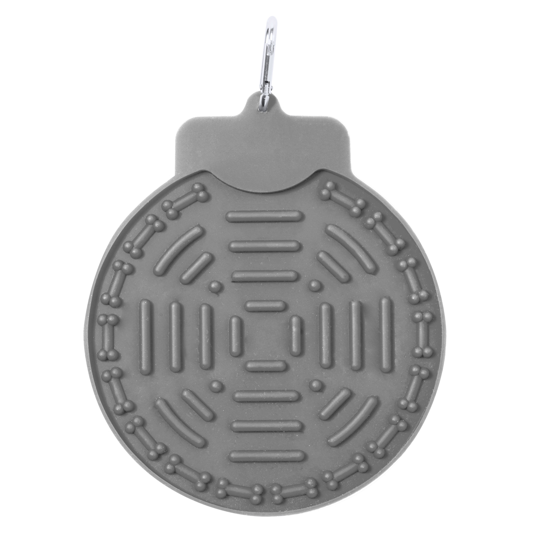 Almofada para animais de estimação para lamber feita de silicone macio. Com ventosas potentes para fixar em superfícies planas, para que os animais de estimação possam lamber a superfície áspera. Mosquetão de transporte embutido para fácil fixação. Apresentada em uma bolsa individual reciclada.