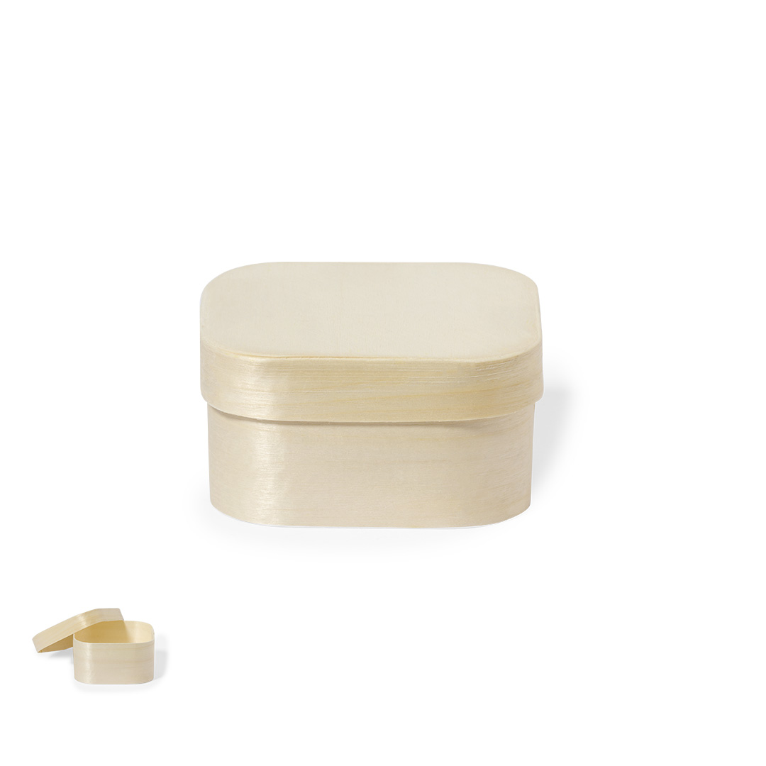 Caixa de apresentação quadrada, fabricada em madeira natural e com tampa a condizer.