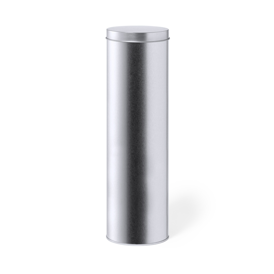 Caixa de apresentação de formato cilíndrico, fabricada em resistente metal de acabamento prateado e com tampa a condizer.