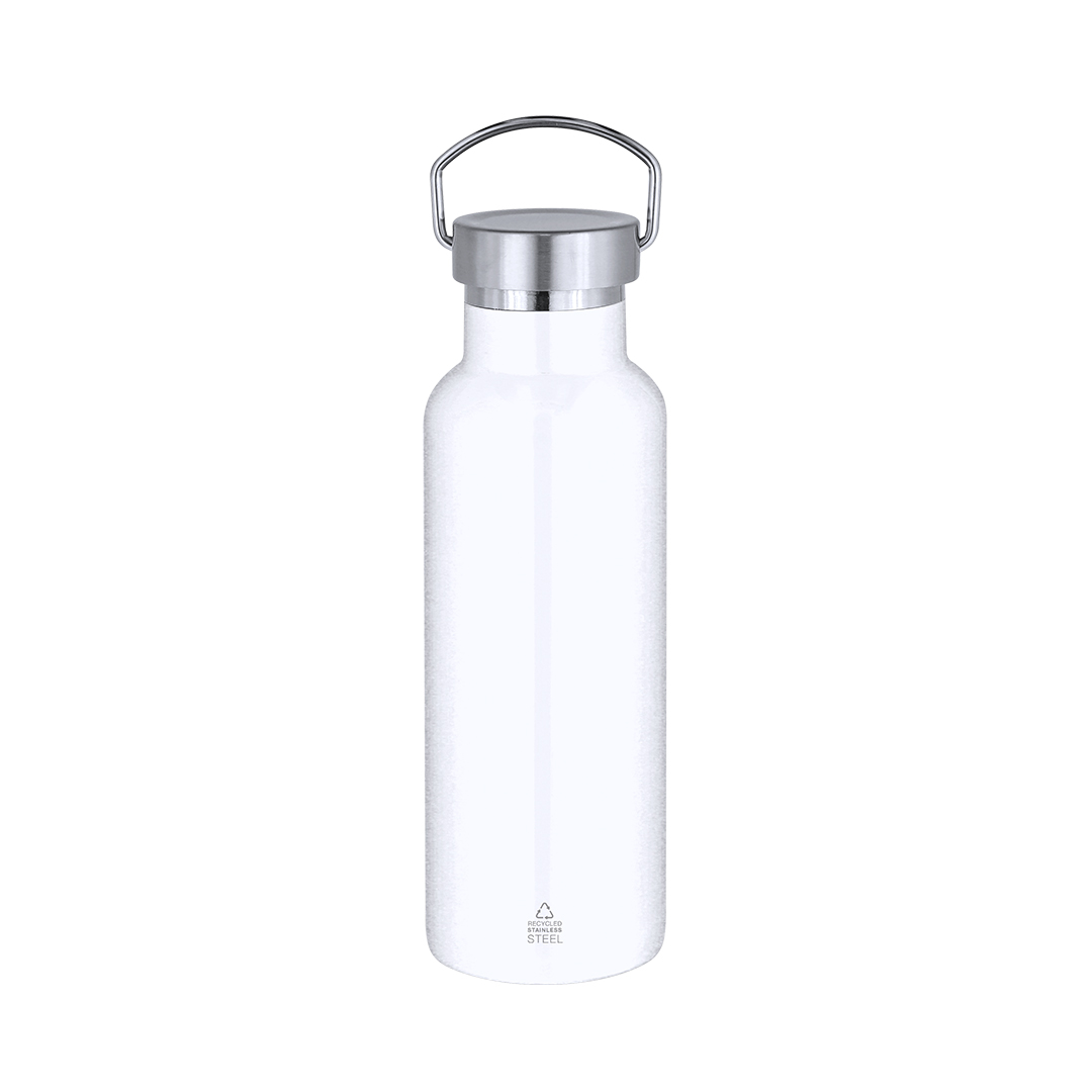 Garrafa térmica fabricada em Aço Inoxidável Reciclado de parede dupla com capacidade de 500 ml. Acabamento em cores vivas com efeito metalizado. Tampa de rosca equipada com asa de transporte. Inclui distintivo de aço inoxidável reciclado. O aço é um dos materiais mais procurados e pode ser encontrado praticamente em todo o lado, desde produtos de uso diário até grandes construções. Com inúmeras propriedades, destacando-se a durabilidade e o elevado grau de reutilização, torna-se uma alternativa muito valorizada em soluções de sustentabilidade. Quando devidamente tratado, permite obter novos recursos de utilização infinita.