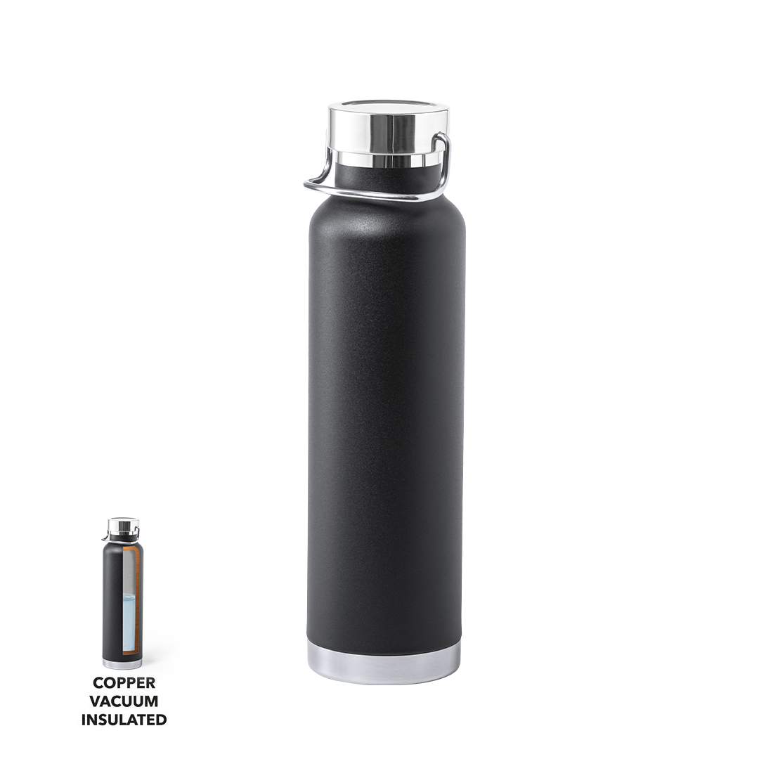 Garrafa térmica de aço inox, com parede dupla e isolamento de cobre a vácuo. O mesmo permite manter o quente e o frio por mais tempo, podendo chegar a 12 e 48 horas respectivamente. De 650ml de capacidade e disponível em uma variada gama de cores metálicas. Apresentado em uma caixa de design atraente.