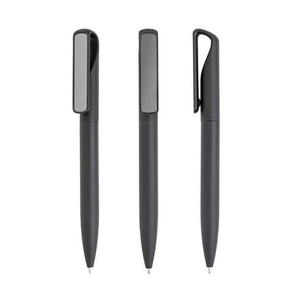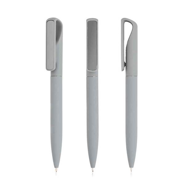 Esferográfica em alumínio, elegante e com acabamento em material emborrachado, para um toque suave e confortável. Possui clip metálico com efeito espelhado que acrescenta um detalhe sofisticado ao design. Escrita a tinta preta, ideal para uso diário no trabalho, escola ou em eventos. Combina estilo e funcionalidade.