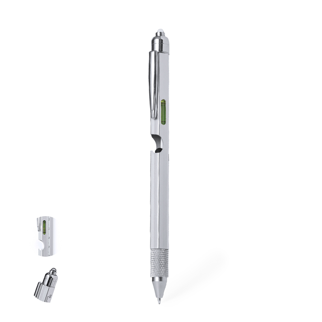 Esferográfica multifuncional 8 em 1 com mecanismo giratório, fabricada em aço inoxidável. Inclui régua em cm e polegadas, nível, abridor, 1 LED alimentado por bateria tipo botão (incluída), ponteiro e pontas planas e philips. Com clip de metal e tinta azul. Apresentado individualmente em caixa de design kraft.