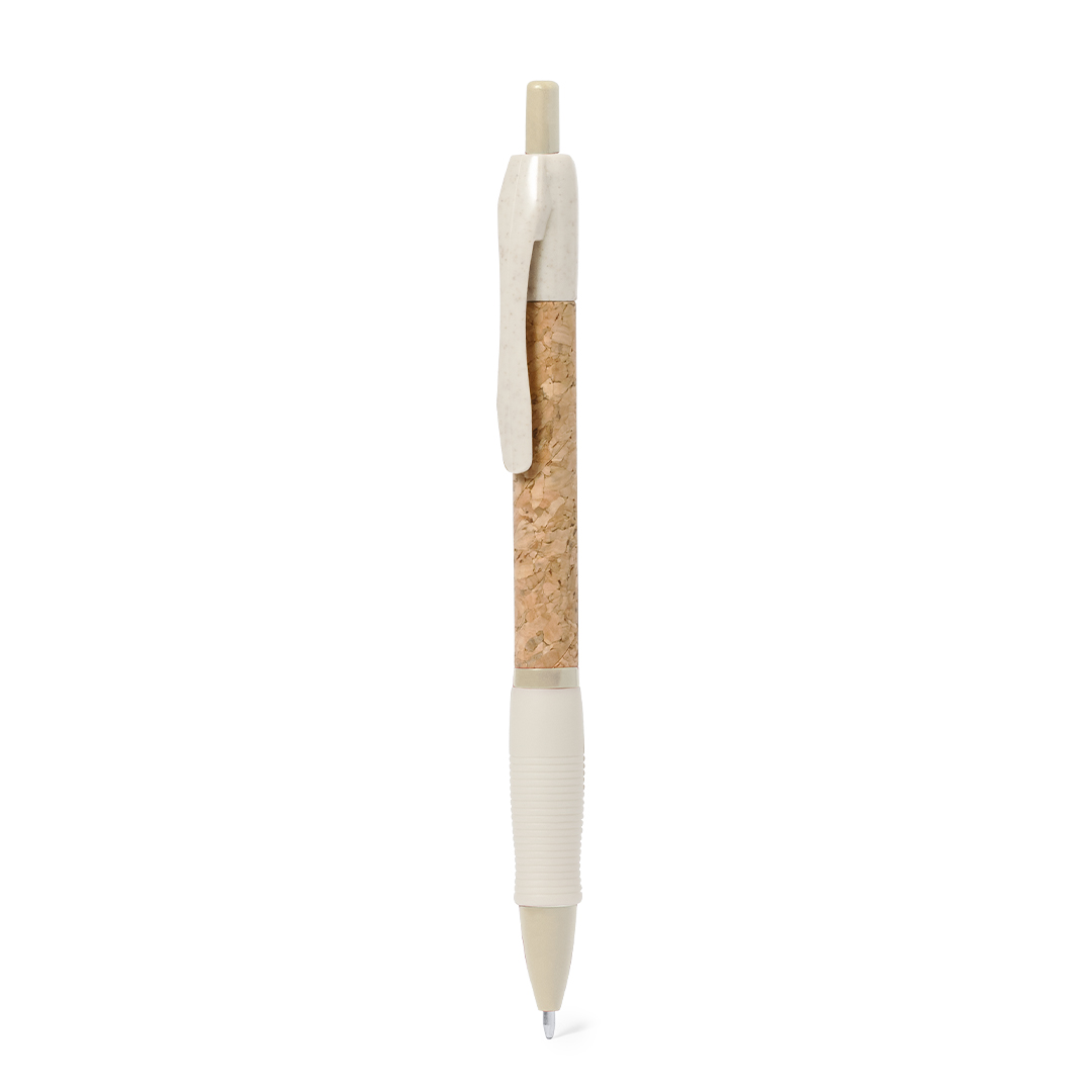 Esferográfica de mecanismo pulsador com corpo em cortiça natural. Clip, ponta e pulsador em palha de trigo. Disponível numa variada gama de cores. Distintivo Wheat Straw na parte superior da esferográfica. Em tinta azul.Elaborada com elementos vegetais, para assim fomentar a utilização de matérias-primas naturais e reduzir as emissões poluentes.
