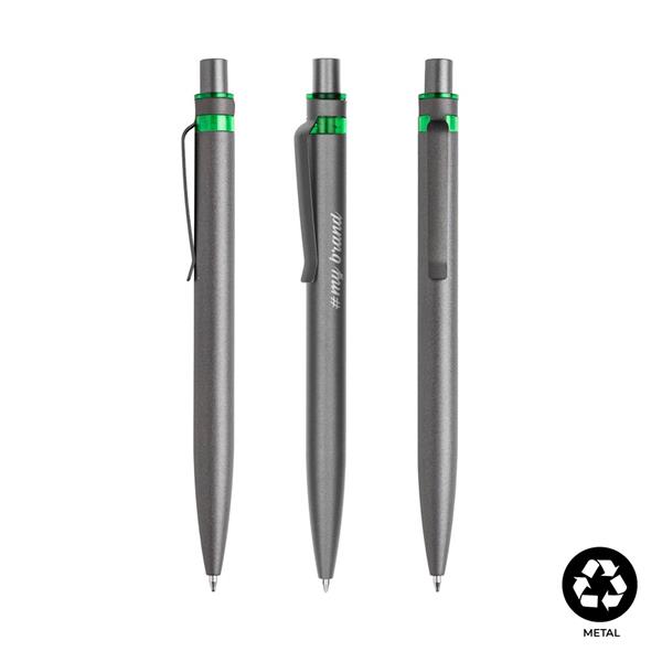 Esferográfica em alumínio reciclado, detalhe colorido. Feita em alumínio reciclado de desperdício e em fim de vida útil, utilizando processos de derretimento e aproveitamento. Ao comprar esta esferográfica, está a ajudar a reduzir as libertações de carbono e a reduzir o lixo derivado da não reutilização.