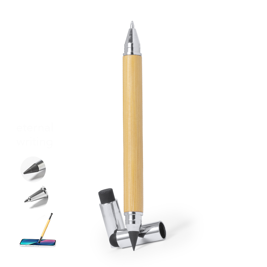 Esferográfica lápis eterno 2 em 1, fabricada em bambu, com corpo de suave acabamento e acessórios cromados. Com fecho de tampa com borracha e ponteiro em cada extremo, inclui esferográfica num extremo (carga jumbo e tinta azul), e lápis eterno no outro extremo, para assim usar sempre o mesmo lápis e no gerar resíduos. Apresentada em bolsa de algodão, com fecho de cordão.