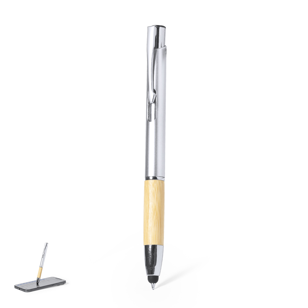 Elegante esferográfica ponteiro de linha nature e mecanismo pulsador. Corpo em resistente ABS de acabamento brilho e cabo em bambu, com acessórios a condizer. Clip metálico, com carga jumbo e com tinta azul.