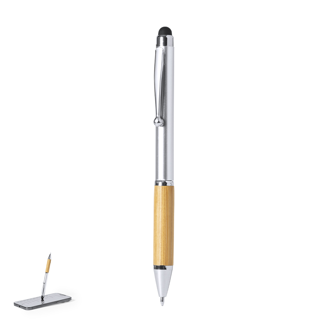 Elegante esferográfica ponteiro de linha nature e mecanismo giratório. Corpo em resistente ABS de acabamento brilho e cabo em bambu, com acessórios a condizer. Clip metálico e com tinta azul.