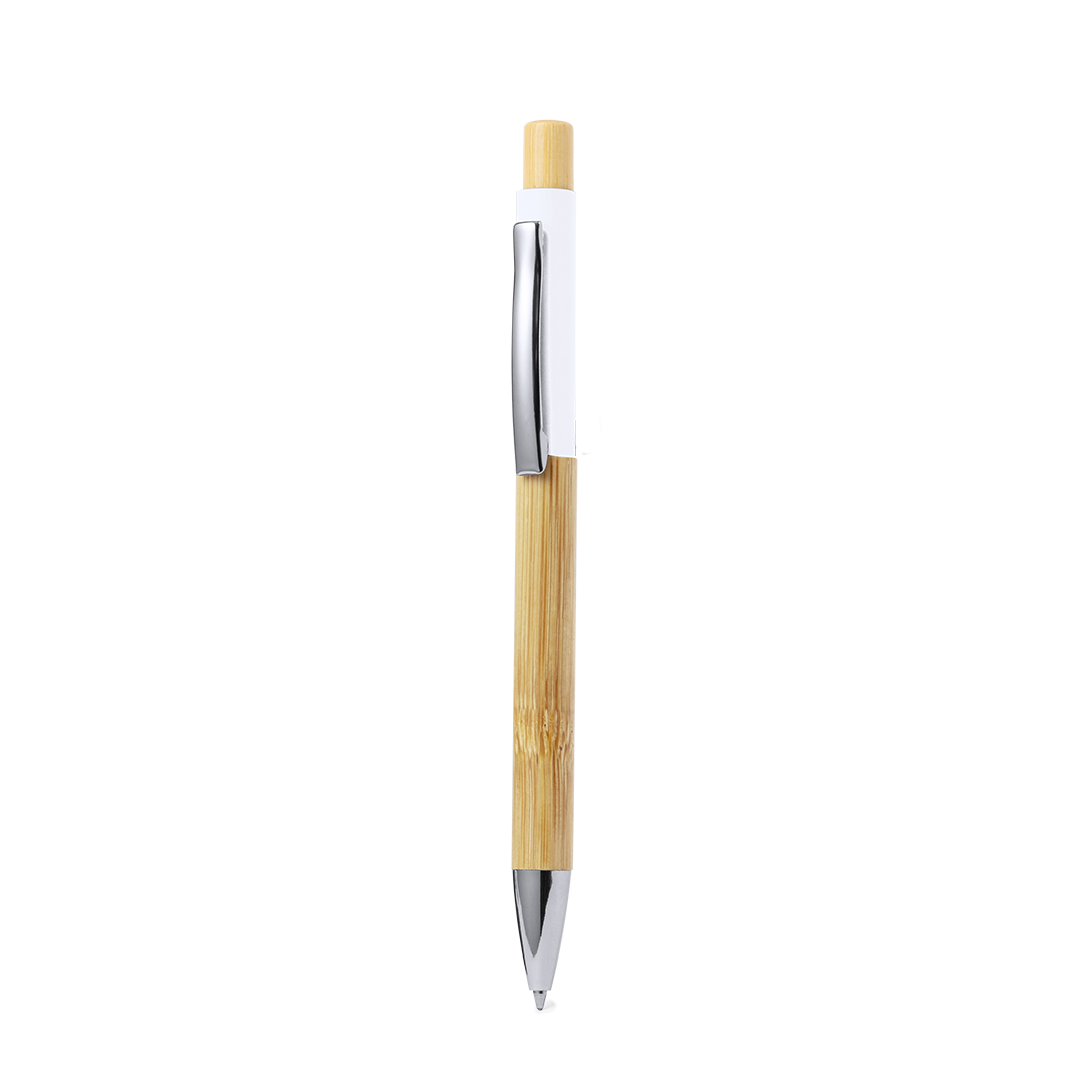 Esferográfica elegante fabricada em bambu. Corpo em alumínio resistente com acabamento aborrachado e cabo em bambu, numa vasta gama de cores distintas. Clip de metal, com mecanismo de botão e tinta azul. Apresentado em saco individual reciclado.Materiais como o bambu favorecem a utilização de matérias-primas naturais, reduzindo as emissões poluentes. Provém de uma planta muito resistente e versátil, de crescimento e regeneração rápidos, o que o torna uma excelente alternativa à utilização da madeira tradicional.