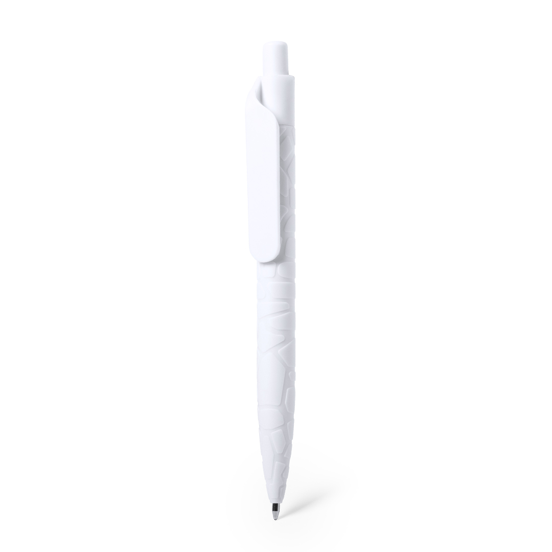 Esferográfica de linha nature e mecanismo pulsador. Corpo recortado fabricado com extratos de pedra natural, ajudando na redução do uso de plásticos, além de proporcionar um acabamento suave e resistente. De cor branca e distintivo pedra natural na parte superior, de carga jumbo e com tinta azul.