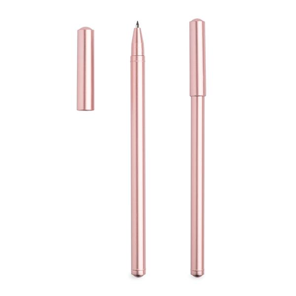 Esferográfica de gel em plástico com acabamento metálico. O plástico de cores metálicas e modernas fazem desta esferográfica um brinde ideal para divulgar o seu projeto. Esferográfica com sistema tampa. Esta esferográfica é de escrita preta.