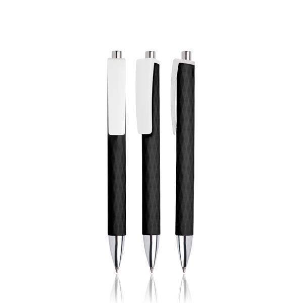 Esferográfica de plástico com clip largo. Escrita preta e sistema pulsar. O que salta à vista nesta caneta é o seu clip largo, branco e perfeito para deixar a sua marca. Se olhar com atenção, outro pormenor preza pela diferença: no corpo, um padrão de losango com textura em relevo. Não ofereça apenas uma esferográfica, aposte no destaque!