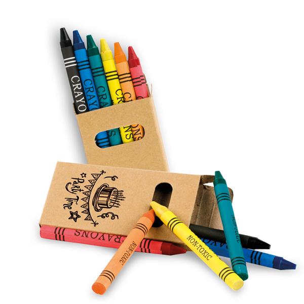 Caixa com 6 lápis de cera. Um conjunto de lápis de cera, com seis cores diferentes, para dar asas à sua imaginação. Numa caixa de cartão com janela e com boa área de gravação.