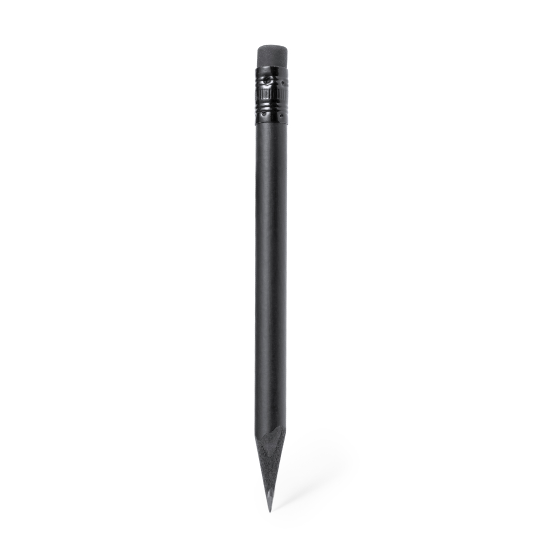 Lápis de madeira natural com acabamento preto mate, com mina preta, ponta afiada e borracha a condizer na parte superior.