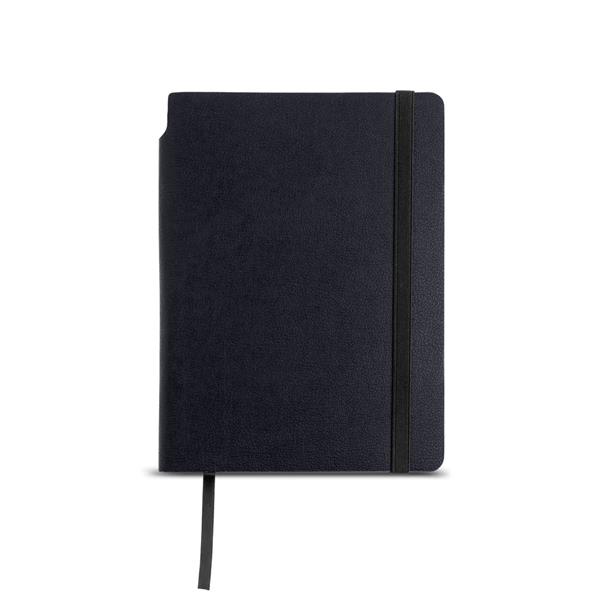 Bloco A5 com capa flexível em PU reciclado térmico, acabamento de cantos arredondados, que garantem maior durabilidade e sofisticação. Possui 160 páginas lisas em papel branco de 80g, com certificação FSC, que assegura a proveniência de florestas geridas de forma responsável. Inclui elástico plano de 1 cm na vertical, que mantém o caderno sempre fechado e seguro, além de um fitilho marcador de 6 mm, prático para localizar páginas com facilidade. Para maior praticidade, apresenta ainda espaço na lombada para acomodar uma esferográfica, tornando-o perfeito para o dia a dia, estudos ou reuniões.