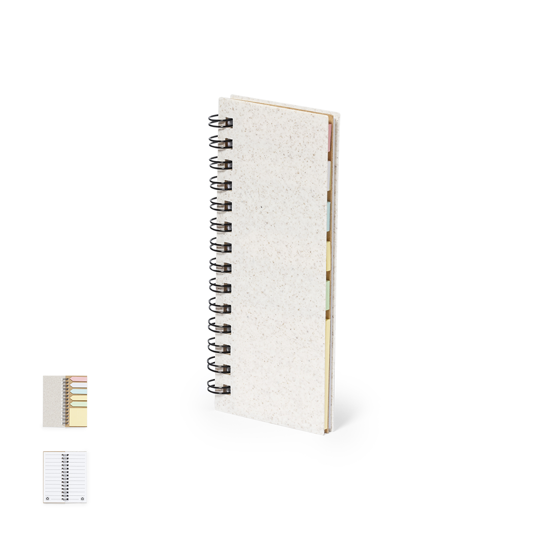 Bloco de notas com capas em fibra de trigo. Com distintivo wheat straw na contraportada. Inclui:Bloco de argolas de 30 folhas brancas com disposição pautada e distintivo reciclado em ambos os lados.25 notas adesivas médias.125 mini notas adesivas em várias cores. Elaborado com elementos vegetais para assim fomentar a utilização de matérias-primas naturais e reduzir as emissões contaminantes.Apresentado em bolsa individual reciclada.