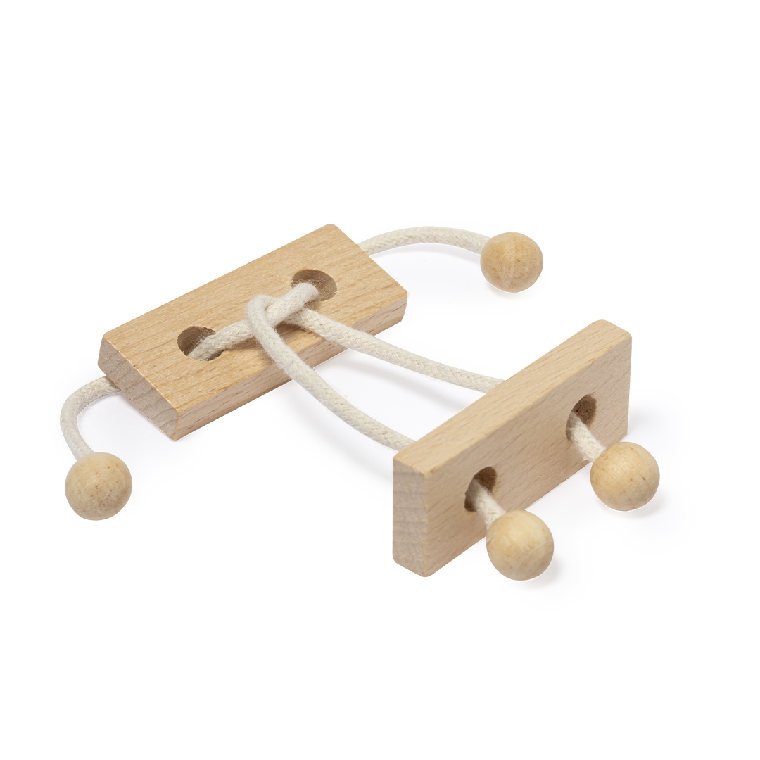 Jogo de habilidade de 2 peças fabricado em madeira. Divertido quebra-cabeças de duas peças unidas por um cordão de madeira, cujo objetivo é descobrir a forma de separar as peças. Apresentado individualmente numa caixa de design kraft.