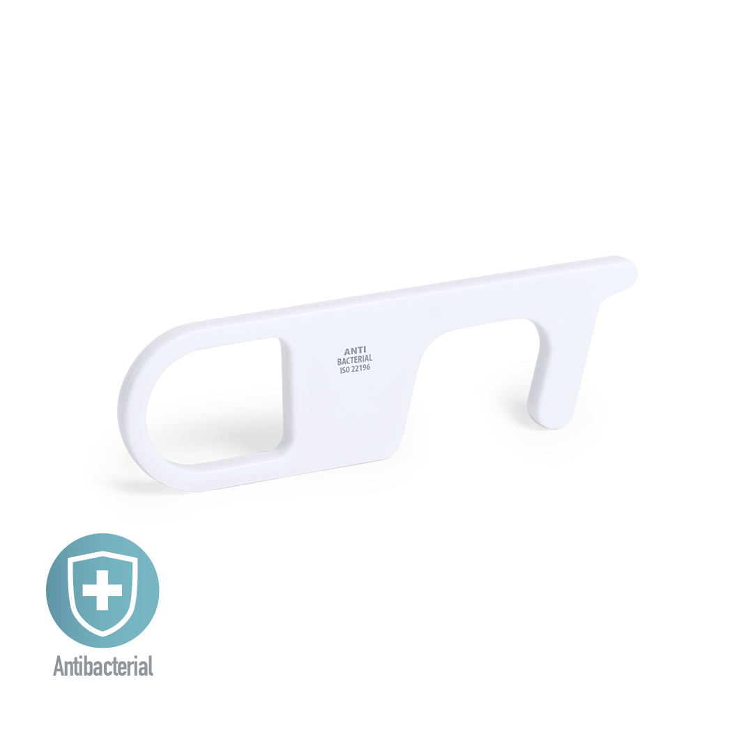 Porta-chaves higiénico anti-bacteriano e anti-contato, fabricado em resistente ABS de acabamento sólido. Especialmente desenhado para evitar tocar com as mãos superfícies de uso comum (maçanetas de portas, interruptores, torneiras de uso público, caixas multibanco…). Com cómodo recorte para o dedo a apresentado em bolsa individual. Recomendado para impressão em tampografia.Os produtos com tratamentos anti-bacterianos são capazes de reduzir drásticamente as cargas bacterianas presentes nas superfícies dos materiais, graças à incorporação de agentes microbianos permanentes estáticos, com alta efetividade para inibir e prevenir a contaminação bacteriana.Artigo de acordo com a ISO 22196, que determina a atividade anti-bacteriana em materiais plásticos e superfícies não porosas, o que permite conhecer a efetividade de inibição microbiana que têm os aditivos sobre os objetos tratados mediante uma avaliação quantitativa.