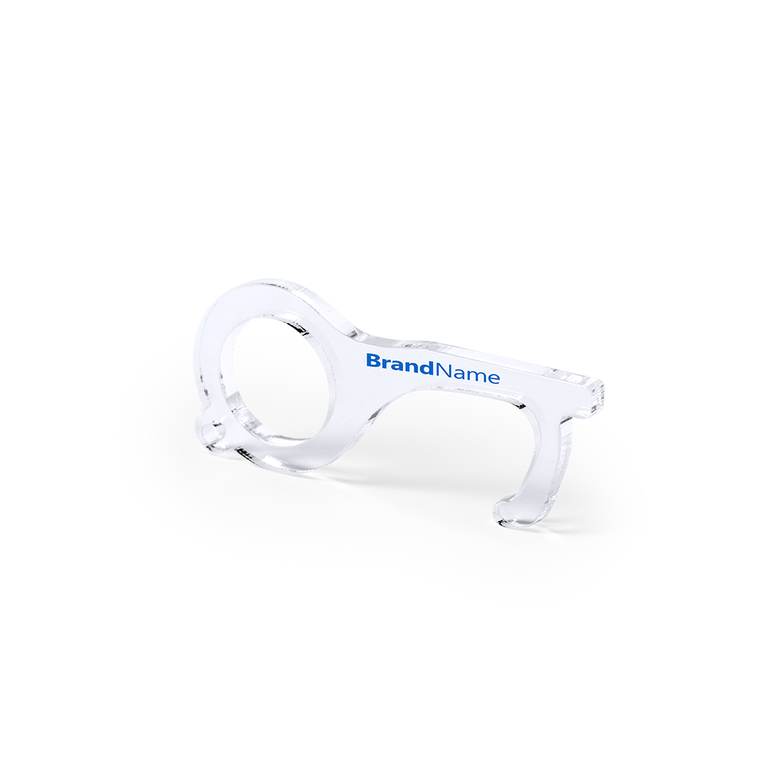 Porta-chaves higiénico anti-contato, fabricado em original e resistente material acrílico de acabamento transparente. Especialmente desenhado para evitar tocar com as mãos superfícies de uso comum (maçanetas de portas, interruptores, torneias de uso público, caixas multibanco…). Com cómodo recorte para o dedo e apresentado em bolsa individual de desenho. Recomendado para impressão em tampografia.
