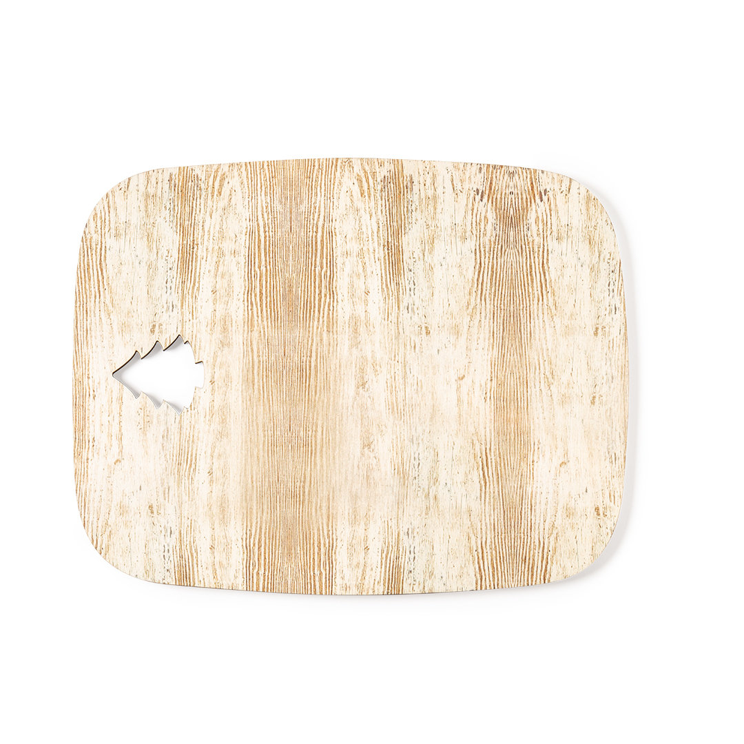 Tábua retangular de corte e apresentação com recorte de árvore de Natal. Fabricada em madeira natural e de original acabamento bicolor. Ampla superfície de impressão e distintivo Made In Europe.