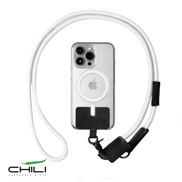 Lanyard em RPET, com suporte para telemóvel . Prática e elegante, perfeita para manter o seu smartphone sempre acessível e em total segurança. Produzida em RPET, um material reciclado e sustentável, oferece resistência, conforto e um compromisso ambiental que faz a diferença. Esta lanyard permite usar o telemóvel ao pescoço ou ao ombro, evitando quedas acidentais e deixando as mãos completamente livres — ideal para viagens, concertos, caminhadas, trabalho ou o dia a dia.O suporte fino encaixa discretamente entre a capa e o telemóvel, sem interferir no carregamento, garantindo uma utilização simples e universal. Disponível em branco e em preto e branco, combina funcionalidade com um design moderno que se adapta facilmente a qualquer estilo — tudo isto com a qualidade a que a Chii já nos habituou.
