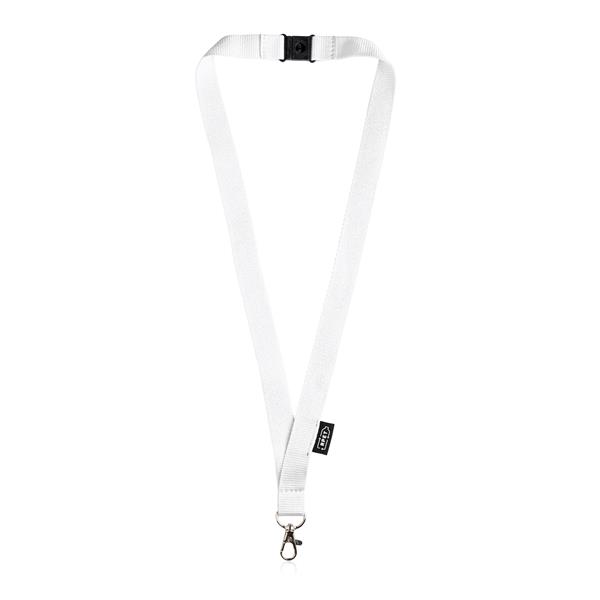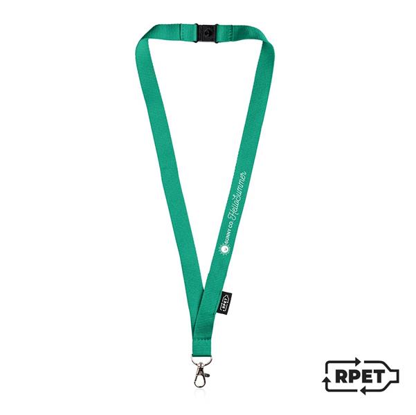 Lanyard em RPET, com mosquetão metálico e fecho de segurança. Formato simples e clássico, disponível em várias cores. Ideal para feiras e congressos, uma vez que se trata de um artigo publicitário com uma grande exposição de fácil personalização e amigo do ambiente
