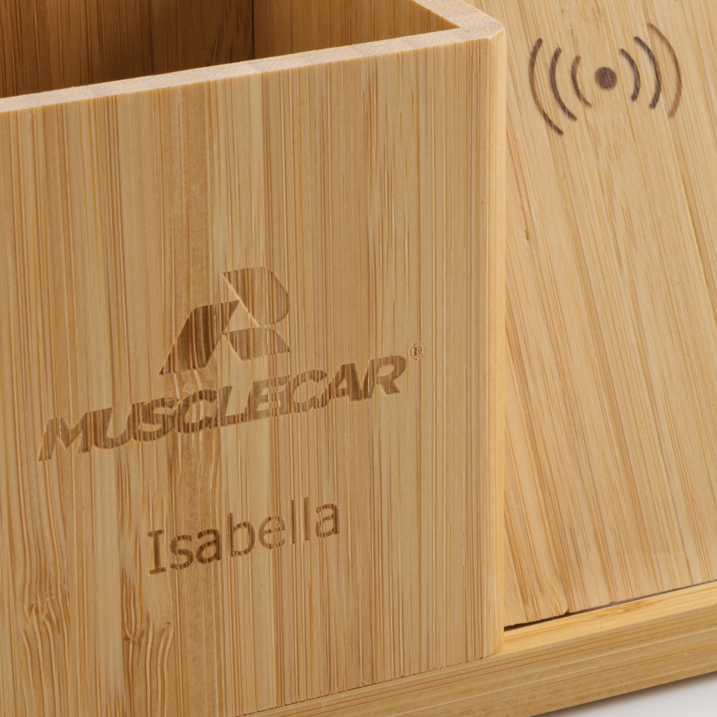 Carregador rápido sem fio de 10 W com porta-lápis feito com ABS reciclado certificado RCS (Recycled Claim Standard). Conteúdo total reciclado: 6% com base no peso total do item (incluindo base de bambu) O exterior de bambu do organizador é feito inteiramente de bambu FSC. Inclui cabo de carregamento Tipo C de 120 cm feito de TPE reciclado com certificação RCS. Apresentado em caixa kraft com mistura FSC. Entrada tipo C; Entrada 5V/2A; 9V/1,67A. Saída sem fio 5V/1A;9V/1.1A (10W). Design Registrado®