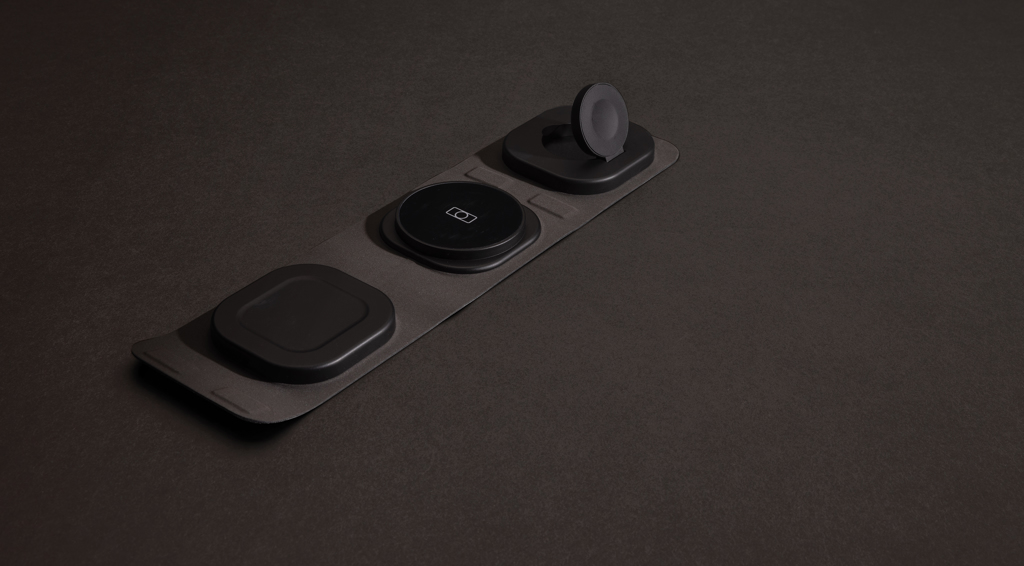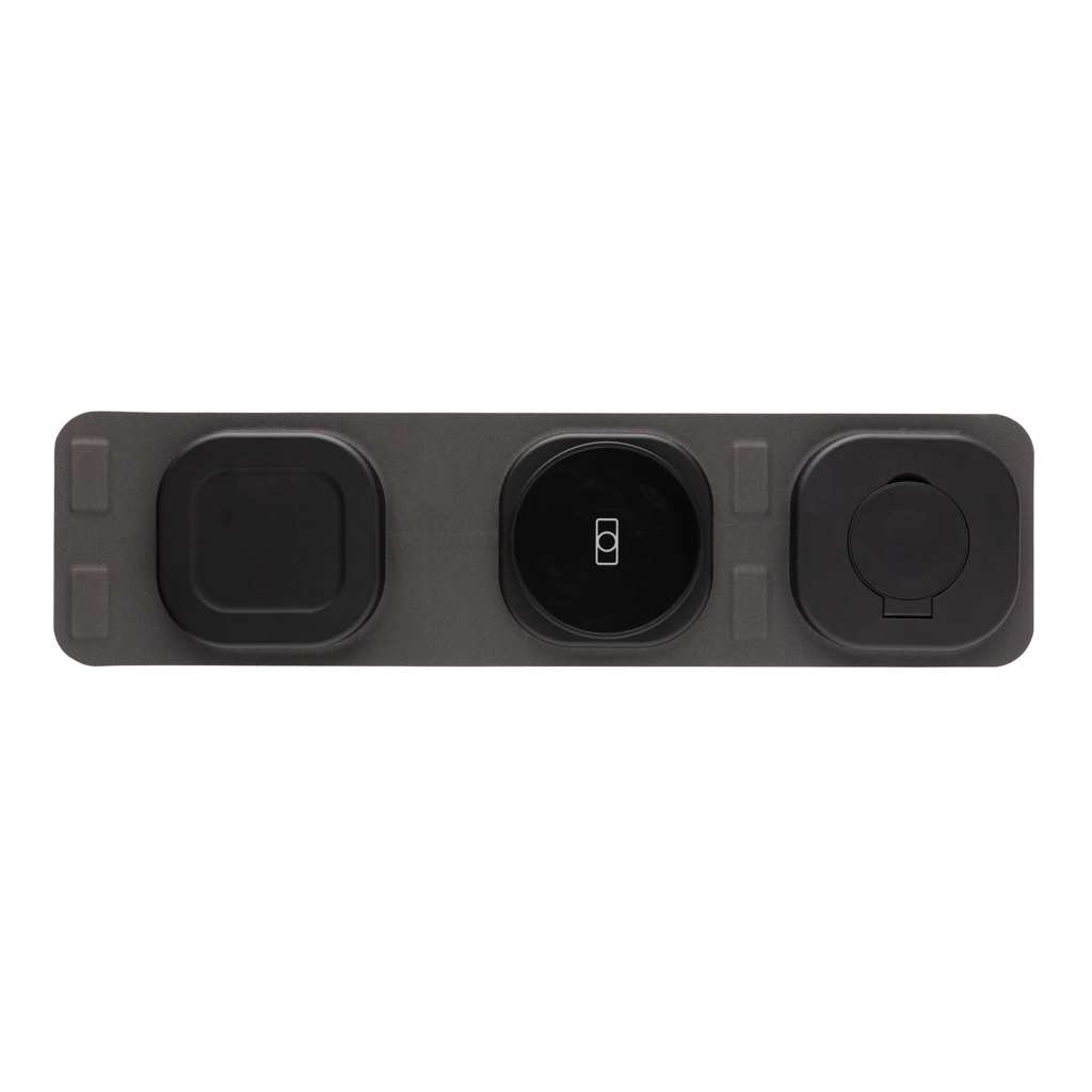 Carregador sem fio 3 em 1 dobrável de luxo feito de ABS reciclado RCS. Conteúdo reciclado total: 38% com base no peso total do item. A certificação RCS garante uma cadeia de abastecimento totalmente certificada para materiais reciclados. O carregador sem fio vem equipado com uma bateria magnética de 15 W e um carregador sem fio adicional de 5 W adequado para capas de fones de ouvido ou outros pequenos dispositivos sem fio que podem ser carregados. Possui um carregador sem fio de 2,5 W para relógios inteligentes (somente relógios Apple). Inclui cabo TPE reciclado de 120 cm com certificação RCS. Apresentado em embalagem kraft mista FSC®. Artigo e acessórios 100% isentos de PVC. Entrada: 9V/3A para uso ideal. Saída: Telefone: 9V/1.1A; 9V/1,67A/(15W), Fone de ouvido: 5V/1A(5W), Relógio: 5V/0,5A.