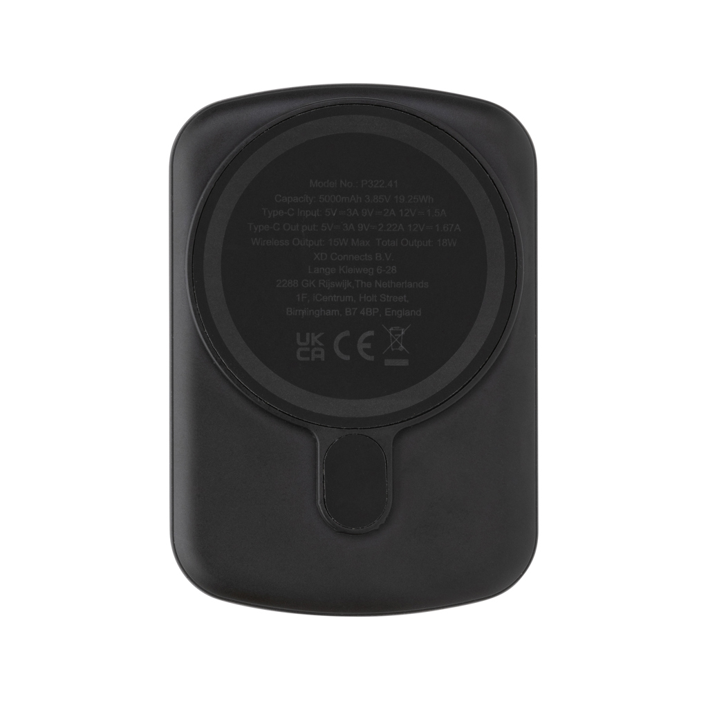 Powerbank de bolso de 5000 mAh com carregador magnético sem fio de 15 W cuja caixa é feita de plástico ABS reciclado com certificação RCS. RCS (Recycled Claim Standard) é um padrão para verificar o conteúdo reciclado de um produto ao longo de toda a cadeia de abastecimento. Conteúdo total reciclado: 21% com base no peso total do item. Ele contém uma bateria de polímero de lítio de grau A de 5000 mAh de longa duração. O display LED digital integrado indicará o nível de energia restante para que você sempre saiba quando recarregar.; Entrada tipo C 5V/2,4A; Saída tipo C: 5V/2A.4A Item e acessórios sem PVC. Inclui cabo de carregamento TPE reciclado certificado RCS. Apresentado em embalagem mista FSC®. Entrada tipo C: 5V/3 A 9V/2 A 12V/1,5 A; Saída: Saída USB-C: 5V/2,4 A, 9V/2,22 A, 12V/1,67 A; Saída sem fio: 15W