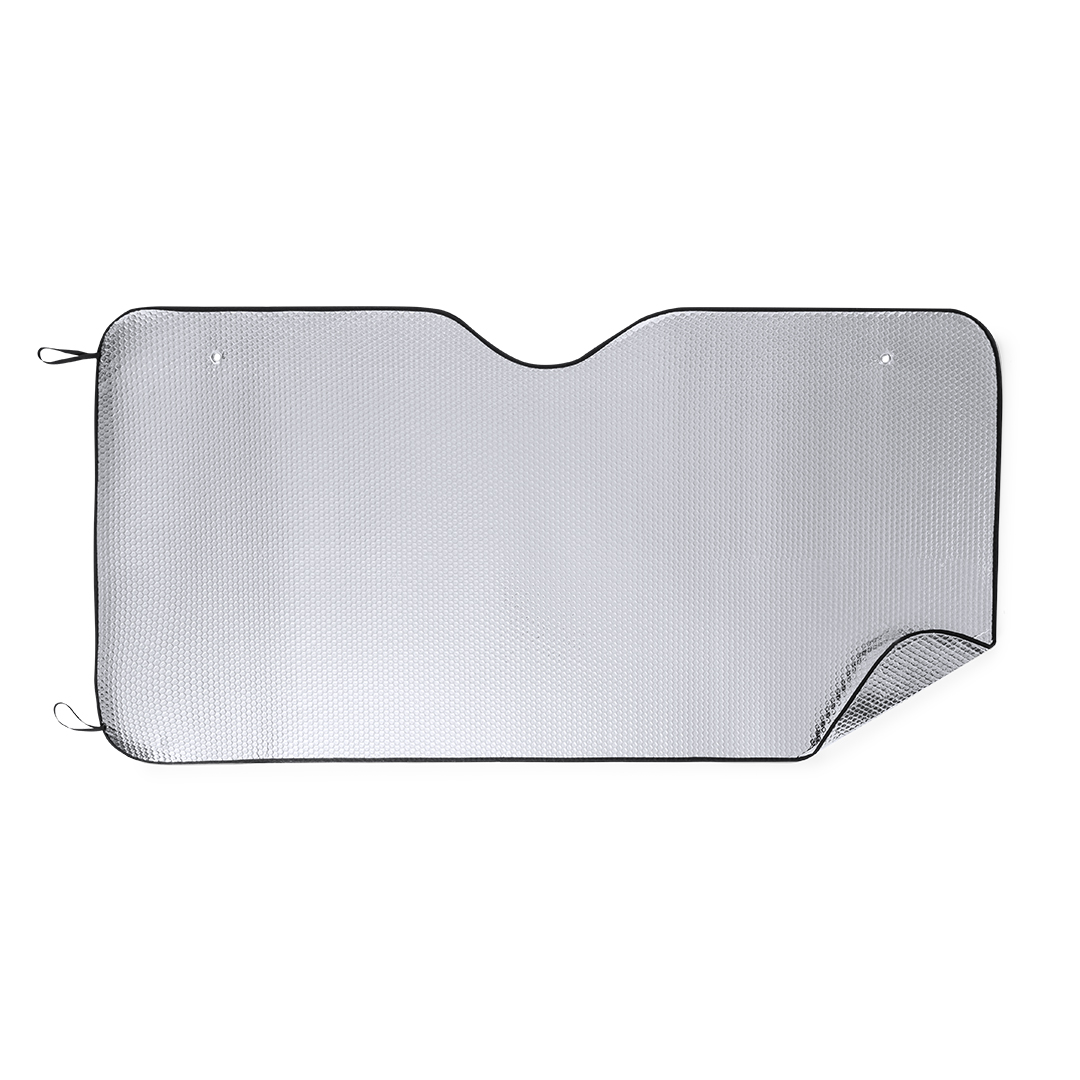 Guarda-sol de alumínio com bolhas em ambos os lados na cor prata com acabamento metálico com frisos pretos. Tamanho Maxi 180x90cm, com anéis de reforço metálicos, correias elásticas para dobrar, duas ventosas para ajuste da lua e apresentação desdobrada em uma placa para fácil impressão.