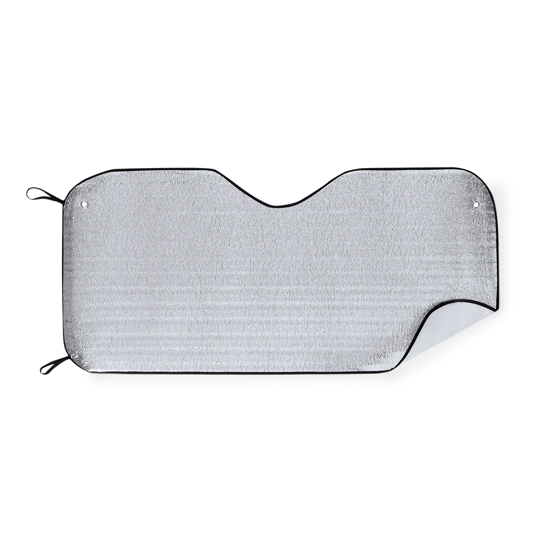 Protetor solar com lado frontal em alumínio e lado traseiro em espuma. Tamanho 130 x 60 cm, com bordas em non-woven e elásticos pretos para dobragem. Inclui 2 argolas metálicas e duas ventosas para ajuste no para-brisa. Apresentação desdobrada em chapa para fácil impressão.