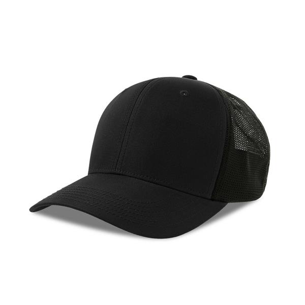 Boné trucker em 100% poliéster reciclado, totalmente fechado, com 6 painéis, sem abertura traseira, com malha elástica para um ajuste confortável e adaptável. Fabricado em poliéster reciclado com tratamento UPF 50 para proteção solar e acabamento resistente à água (sem PFC).