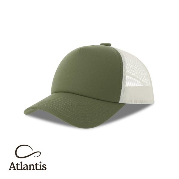 Boné trucker em poliéster reciclado. 5 painéis, pala semi-curva, lateral e traseira em rede de poliéster reciclado, visor Retraze e fecho em PVC atrás. 280gsm, 100% poliéster reciclado.