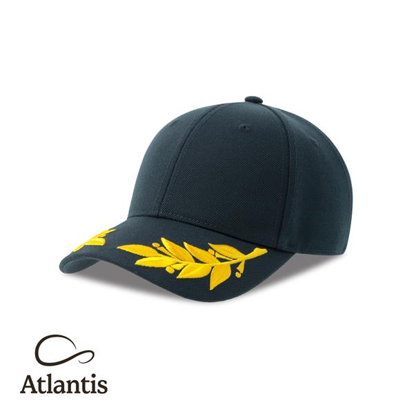 Boné de basebol estruturado em poliéster reciclado. 6 painéis, 6 ilhós, pala semi-curva com folhas de louro bordadas na mesma, visor Retraze e fecho metálico. 300gsm, 100% poliéster reciclado.