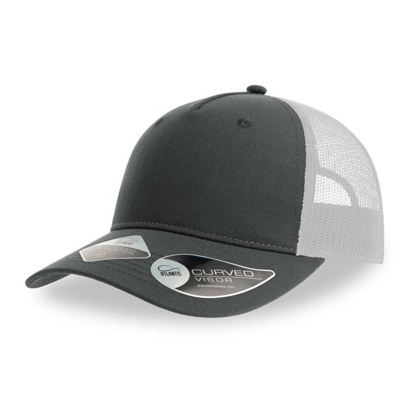 Boné trucker clássico, com 5 painéis, em Sarja de Poliéster reciclado. Malha traseira em poliéster reciclado e fecho traseiro em PVC reciclado. Parte frontal ampla, ideal para bordados e patches. 100% Poliéster reciclado certificado e fecho em PVC reciclado